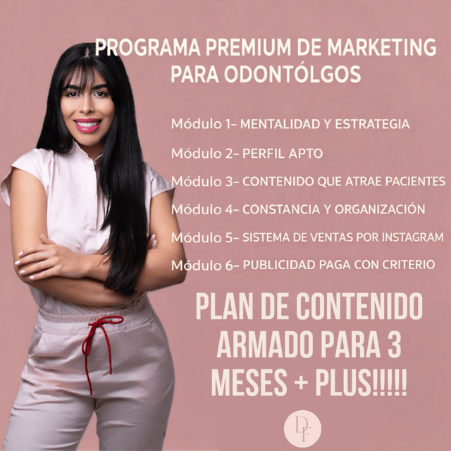Aprende a atraer pacientes reales desde Instagram con una estrategia clara, ética y aplicable, sin depender de modas ni pasar horas creando contenido. Incluye posicionamiento profesional, creación de contenido que educa y vende, sistema de historias que convierten, organización mensual de publicaciones y acompañamiento digital para implementar paso a paso. También incluye un plan de contenido de 3 meses que incluye reels, post e historias para que vos no tengas que pensar en ideas en todo ese tiempo. Diseñado para odontólogos que quieren más visibilidad, más consultas y una marca profesional en redes, incluso con poco tiempo.